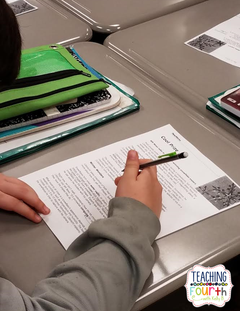 Next, I used the nonfiction article “Cool Prize” from Readworks.org. (There is also a fabulous lesson for Snowflake Bentley that you may choose to use on this website.) If you don’t already have a free membership to Readworks, it is very easy to join, free, and packed with amazing articles, lessons, and passages with question sets. My students “chunked” the text “Cool Prize”, which means that we broke down the article as we read it in order to read closely and understand the text. This is a guided whole group lesson that helps students read with purpose. I have included the directions and questions that I gave to my students as we broke this text down, but of course, you can guide your students to search for key information or ask skills related questions that best meet the needs of your students.This is a strategy that my students and I love.