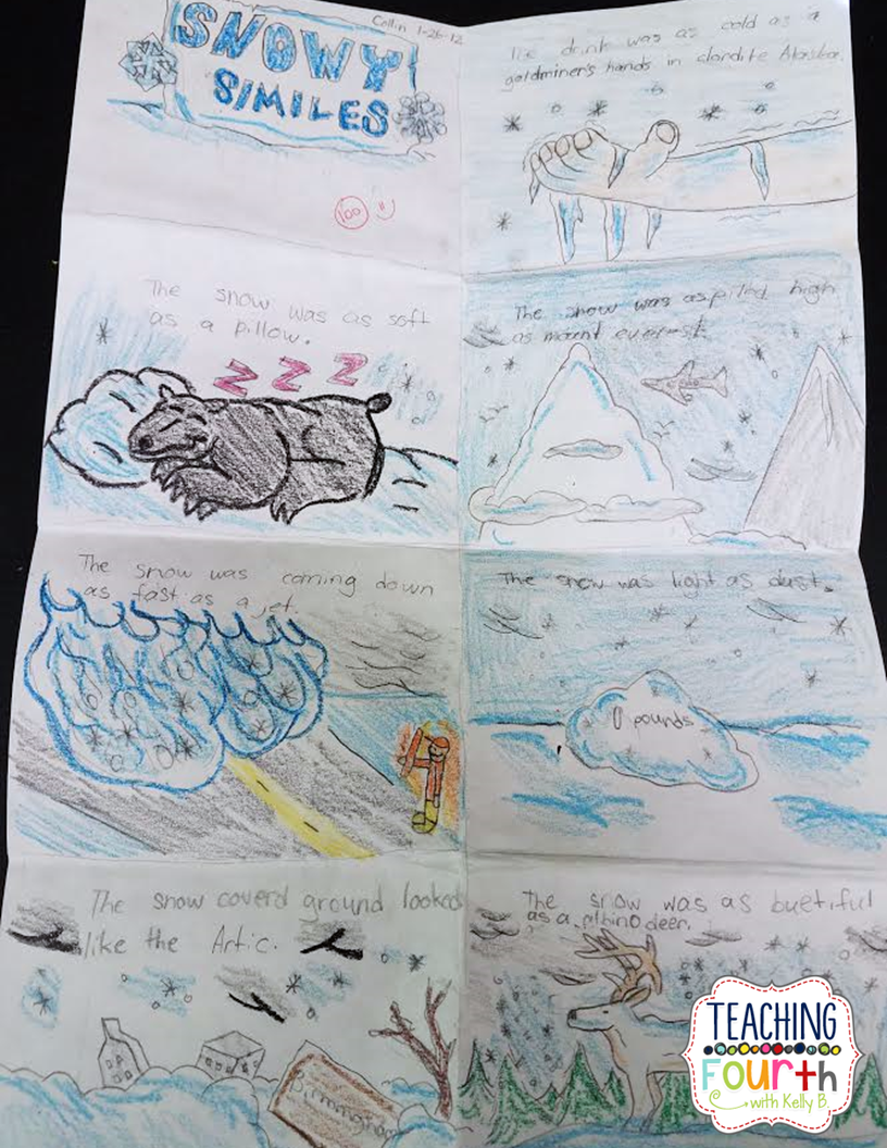 The following day, I read aloud the book Snow by Cynthia Rylant and discussed figurative language found in this book. This book contains several similes and examples of personification. I then reread the two examples of similes found in Snowflake Bentley. My students then created Snowy Similes posters. We simply took a large sheet of white construction paper, folded it in half 3 times, and opened it back up to create 8 sections. In the first section, students wrote Snowy Similes. In the remaining spaces, students created 7 similes about snow or winter and drew pictures for each. These turned out so cute and look fabulous displayed in the hallway.